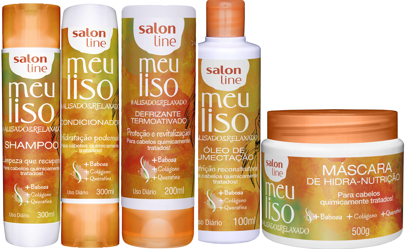 Indicado para cabelos lisos ou quimicamente tratados, o Meu Liso #Alisado&Relaxado possui Babosa, Colágeno e Queratina, ativos que oferecem hidratação e nutrição, recuperando a saúde dos fios, além de prolongar o efeito mais liso. É a linha mais completa, com Meu Liso #Alisado&Relaxado Shampoo 300ml, que tem preço sugerido de R$14,90; condicionador Meu Liso #Alisado&Relaxado de 300ml com preço sugerido de R$14,90; Meu Liso #Alisado&Relaxado Máscara de Hidro-Nutrição 500g com preço sugerido de R$14,70; Meu Liso #Alisado&Relaxado Óleo de Umectação 100ml com preço sugerido de R$13,90 e o Meu Liso #Alisado&Relaxado Defrizante Termoativado de 200ml que tem preço sugerido de R$13,99.