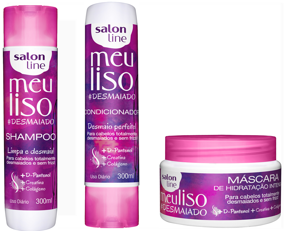 Com Creatina, Colágeno e D-Pantenol, o Meu Liso #Desmaiado promete hidratação do cabelo liso e redução do frizz, além de manter os fios totalmente desmaiados. Tem o preço sugerido de R$14,90 para shampoo ou condicionador de 300ml. Também possui uma mascara de 300g, que garante hidratação intensa com preço sugerido de R$14,70.