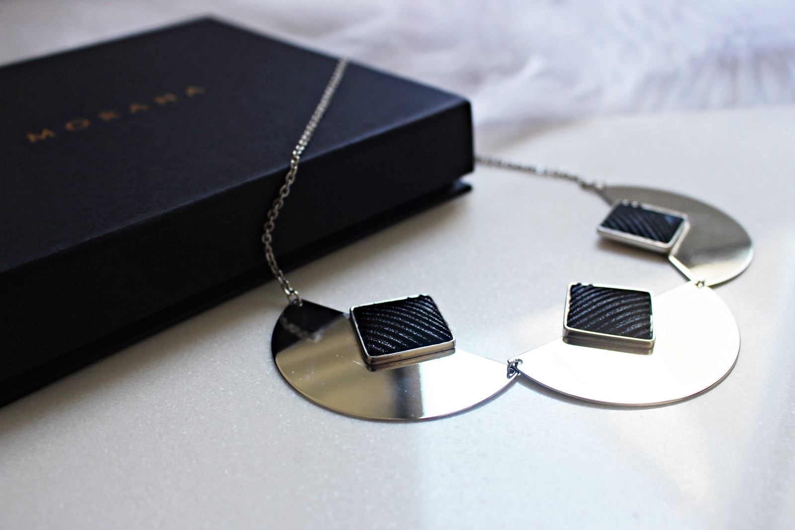 Recebi esse colar lindo, um dos lançamentos da campanha, com placas prateadas feitas a mão e aplicações. Belíssimo, né?